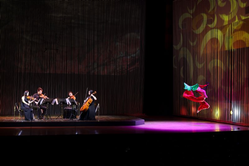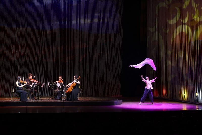 演颂会在我院室内乐团演奏的《延安颂》中拉开序幕。乐曲气势宏大、委婉流畅,将抒情性与战斗性有机融合,追溯了延安红色血脉,抒发了中国青年对祖国美好未来的无限憧憬之情。著名演播艺术家房明震在钢琴与中提琴唯美的乐曲中,满怀激情地朗诵了毛主席诗词《沁园春•雪》。全词融议论、抒情于一炉,大气磅礴、感情奔放,颇能代表毛主席诗词的豪放风格。弦乐四重奏《游击队之歌》旋律轻松流畅、生动活泼,节奏感强,与舞蹈演员不同的状态切换相融合,表达了游击队员灵活与敌人周旋、伺机消灭敌人的典型形象。在弦乐四重奏《映山红》《红星歌》的旋律中,舞蹈演员通过肢体语言的演绎,塑造出不同阶级的人物造型,不仅表达了劳苦大众渴盼红军归来的强烈心声,更表现出与黑暗势力殊死搏斗的革命意志。乐曲《毛主席的话儿记心上》运用深入浅出、通俗易懂的音乐语言,通过影像衔接毛主席在延安文艺座谈会上的讲话,表达了对毛主席的无限景仰与热爱。《翻身道情》全曲节奏欢快、旋律朴实优美,陕北道情热情奔放的音调与酣畅淋漓的舞蹈表演水乳交融,表达了劳苦大众在中国共产党的领导下翻身做主人的喜悦心情。根据人民音乐家冼星海的名作改编的钢琴曲《黄河颂》,大气奔放的旋律配以铿锵有力的朗诵,歌颂了黄河博大、豪放的雄姿,赞美了中华民族不畏强暴、同仇敌忾的英雄气概。器乐曲《初心》曲调悠扬、悦耳动听,展现了革命先辈用鲜血和生命铸就的雄壮历史,表达了中国共产党人牢记初心使命、奋力走好新时代长征路的坚定信念。结束曲《领航》激情昂扬的旋律与恢弘壮阔的画面相呼应,展现了中国共产党光辉的奋斗历程,表达了亿万人民在党的领导下昂首阔步新征程的时代主旋律,将整场演颂会推向高潮。