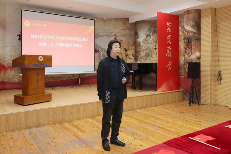 赵恒心在讲话中对我院大学生红色理论宣讲团“送理论到基层”活动给予充分肯定。他指出,持续深入学习宣传贯彻党的二十大精神是当前和今后一个时期的首要政治任务。广大青年学生要深学细研笃行,把思想和行动统一到党的二十大精神上来,把智慧和力量凝聚到完成党的二十大确定的各项任务上来。赵恒心对下一步宣讲工作提出三点希望:一是宣讲团成员要学深悟透习近平新时代中国特色社会主义思想,发挥好引领示范作用。做好党的创新理论的“青年化”阐释,深刻把握党的二十大精神的核心要义,不断激发理论宣讲的内在动力,讲好“青年话”、体现“青年味”,用朋辈声音传递信仰力量,迅速在全院掀起理论学习的新热潮。二是广大青年学生要主动担当,发挥好青年先锋力量。深入学习习近平新时代中国特色社会主义思想,争当党的创新理论的坚定信仰者、积极传播者和模范践行者,坚定不移听党话、跟党走。积极发挥专业优势,为时代放歌、为人民起舞,用生动的社会实践、优秀的艺术作品、高昂的青春激情为中国式现代化建设贡献沈音力量。三是学团部门要牢记为党育人、为国育才使命,发挥好引导服务作用。准确把握党的青年工作的历史方位和时代使命,传承弘扬沈音红色基因,深化大学生爱国主义教育,开展学雷锋志愿服务、艺术惠民、社会实践活动,引导大学生增强社会责任感、使命感。切实将党对青年的关爱转化为服务青年发展的工作举措,完善“我为青年办实事”工作载体,倾听青年心声、解决青年诉求,在服务青年发展成长中巩固党执政的青年群众基础。