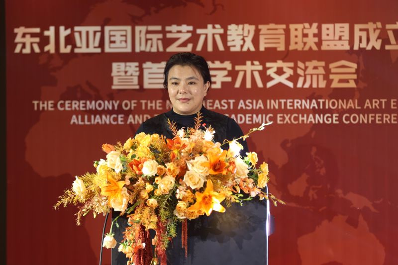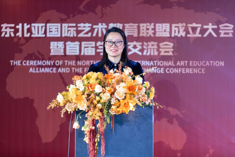 辽宁省教育厅国际交流合作处处长韩冬梅致辞,她对东北亚国际艺术教育联盟的成立表示祝贺,希望在我院和各国院校的共同努力下,东北亚各国艺术教育交流与合作更加深入密切。