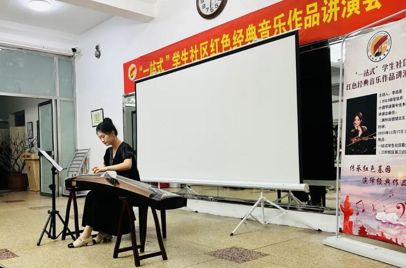 本期讲演会曲目为《满怀深情望北京》(小提琴版),由管弦系2023级本科生李品诺主讲。同时,应相关社区领导的要求,本期讲演会对往期部分优秀讲演曲目进行了展演。讲演会上,李品诺与民族器乐系2022级本科生梅依燃、民族声乐系2022级研究生黄瑶3位主讲人紧扣“红色经典音乐”主题,结合自身专业学习以及对作品的感悟,分别讲述了乐曲《满怀深情望北京》(小提琴版)、《井冈山上太阳红》(古筝版)和歌曲《万泉河水清又清》《红色娘子军军歌》等作品的创作故事,阐释了这些经典音乐作品之所以广为流传、经久不衰的原因,并详细讲解了作品曲式结构以及在演奏、演唱过程中的情感表达。李品诺和梅依燃分别为现场观众完整演奏了《满怀深情望北京》(小提琴版)和《井冈山上太阳红》(古筝版)。来自民族声乐系女子民歌合唱团的8名成员与来自钢琴系的2023级研究生于庆凯作为特邀嘉宾,与黄瑶一起为现场观众带来经典歌曲《万泉河水清又清》《红色娘子军军歌》。