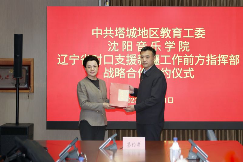 签约仪式上,赵恒心代表学院党委对刘欣一行表示热烈欢迎。他指出,我院与塔城地委教育工委、辽宁援疆前方指挥部开展深度合作,是全面落实党的二十大精神,深入贯彻习近平总书记关于新疆工作和对口支援工作的系列重要指示精神,落实第九次全国对口支援新疆工作会议精神和省委郝鹏书记率团在新疆考察调研对口援疆工作时的要求的具体体现,是持续深化教育对口援疆工作的重要举措。我院将充分发挥专业优势和人才优势,在学科建设、平台建设、项目申报、技术服务、教师学生交流等方面开展深度合作,进一步支持塔城地区艺术教育和文化艺术事业发展,不断推动文化润疆工作取得新成效、开创新局面。
