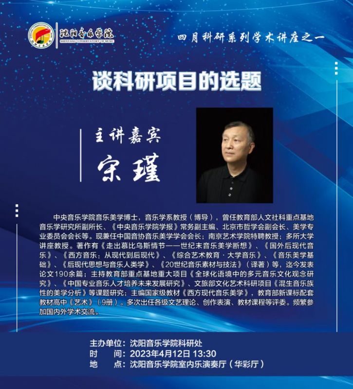 嘉宾简介:宋瑾,中央音乐学院音乐美学博士,音乐学系教授(博导),曾任教育部人文社科重点基地音乐学研究所副所长、《中央音乐学院学报》常务副主编、北京市哲学会副会长、美学专业委员会会长等。现兼任中国音协音乐美学学会会长;南京艺术学院特聘教授,多所大学讲座教授。著作有《走出慕比乌斯情节一一世纪末音乐美学断想》《国外后现代音乐》《西方音乐:从现代到后现代》《综合艺术教育·大学音乐》《音乐美学基础》《后现代思想与音乐人类学》《20世纪音乐素材与技法》(译著)等,迄今发表论文190余篇:主持教育部重点基地重大项目《全球化语境中的多元音乐文化观念研究》《中国专业音乐人才培养未来发展研究》、文旅部文化艺术科研项目《混生音乐族性的美学分析》等课题研究;主编国家级教材《西方现代音乐美学》,教育部新课标配套教材高中《艺术》(9册)。多次出任各级文艺理论、创作表演、教材课程等评委。频繁参加国内外学术交流。