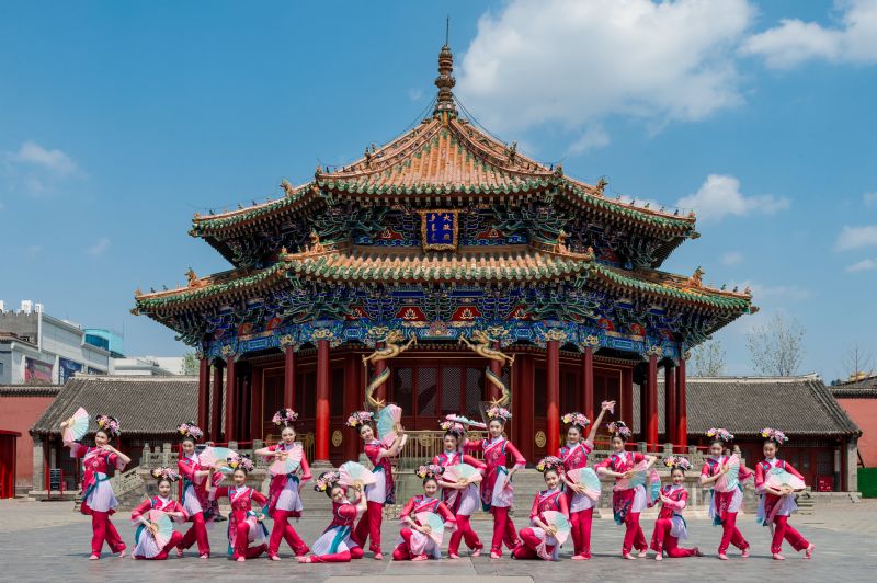 在大政殿前,舞蹈学院的同学们正在表演再现非物质文化遗产“满族秧歌”原始形态的群舞《满韵情》。作品将笊篱舞、嘎啦哈、打冰嘎等满族文化进行创新升华,将真情实感融于秧歌舞蹈之中,不仅展示了非遗秧歌舞蹈文化的独特价值,更体现出辽宁地区浓郁的地域文化特色。惊艳亮相河南卫视“2024清明奇妙游”节目的同学们携群舞《清风徐来》来到沈阳故宫,让现场观众感受“徐徐而来的春风”,体验人间四月天的春日气韵。作品《清风徐来》以清代《执扇就座仕女图》为典范,用女子团扇舞的方式表现清代仕女画中的意境美。