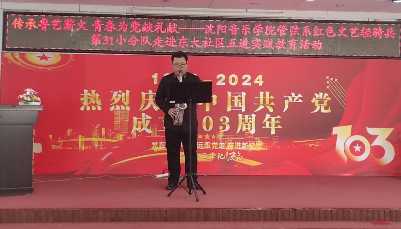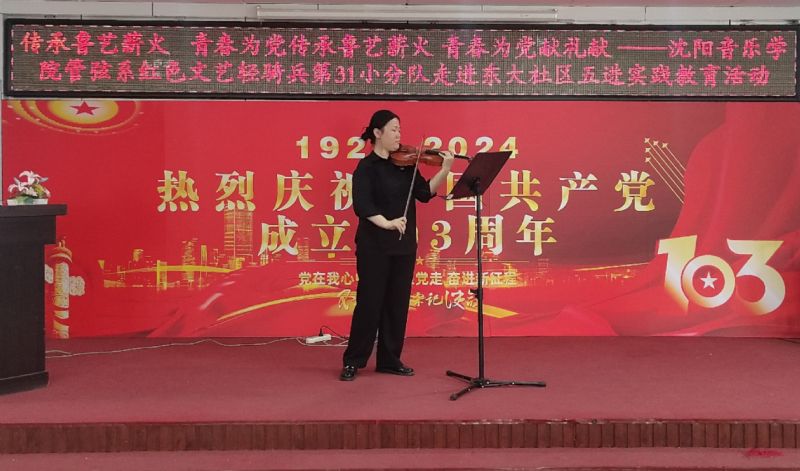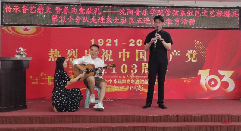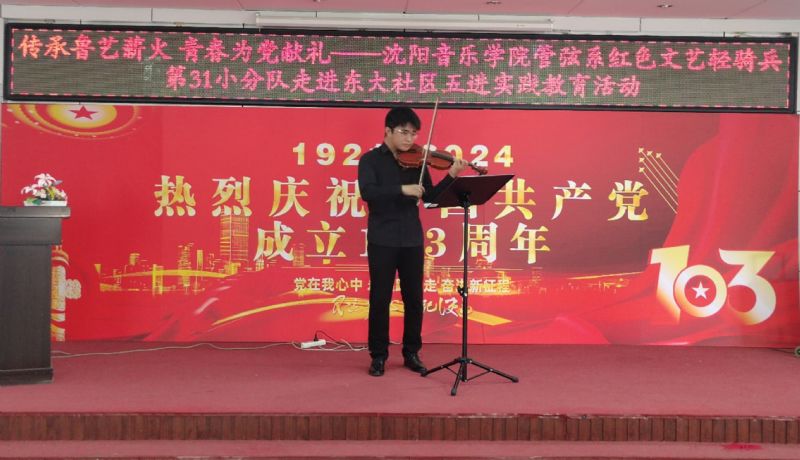 7月1日,“红色文艺轻骑兵”管弦系小分队与管弦系师生党员,走进和平区东大社区,开展“传承鲁艺薪火,青春为党献礼”五进实践教育党日活动,重温党的光辉历史,讴歌党的丰功伟绩,庆祝党的103周年华诞。