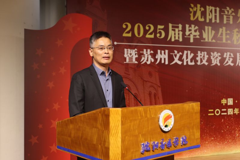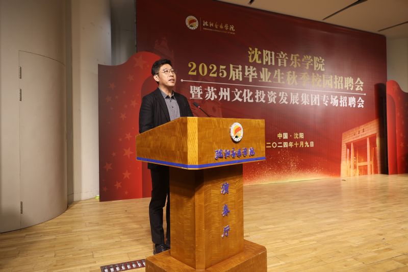 庞渤在招聘会上讲话。他代表学院对钱菊兴一行来院招聘表示欢迎。他表示,沈阳音乐学院是一所历史悠久、具有光荣传统的高等音乐艺术院校,建院86年来,为党和国家培养了大批优秀的音乐舞蹈人才。学院始终高度重视毕业生就业工作,紧密对接国家和地方经济文化建设对人才的需求,不断提高人才培养质量和社会需求的契合度,全力促进毕业生高质量充分就业。他希望双方深化合作交流,为毕业生搭建优质的就业平台,实现校企共赢共进。他对即将走向工作岗位、走向社会的毕业生们提出期望。一是厚植爱国情怀,做脚踏实地的有志青年。希望同学们用艺术点亮人生,用才华服务社会,立志把自己的小我融入祖国的大我、人民的大我之中;二是赓续红色血脉,做求真务实的有识青年。希望同学们在求知的路上不畏艰难、勤于奋斗,用心、用情、用力讲好辽宁故事、讲好中国故事。三是谱写青春之歌,做超越自我的有为青年。希望同学们紧跟时代步伐,发挥专业优势,以饱满的热情、一往无前的奋斗姿态,为繁荣发展社会主义文艺事业贡献沈音力量。