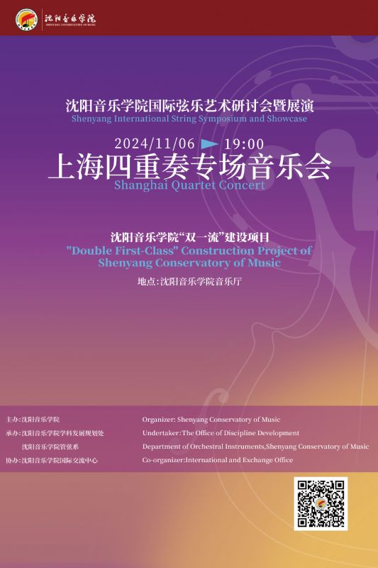 音乐会名称:沈阳音乐学院国际弦乐艺术研讨会暨展演——上海四重奏专场音乐会(沈阳音乐学院“双一流”建设项目) 音乐会时间:2024年11月6日19:00 音乐会地点:沈阳音乐学院音乐厅