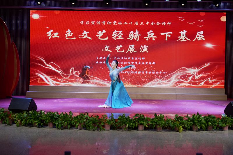 文艺展演在“红色文艺轻骑兵”小分队成员《灯火里的中国》深情悠扬的歌声中拉开了帷幕。竹笛独奏《万疆》,温婉细腻的曲调娓娓道来,优美的旋律充满蓬勃朝气和希望,表达出对祖国大地国泰民安的赞美之情。二胡演奏《光明行》以“中国气派”进行曲的形式,通过激昂有力的曲调和豪迈乐观的情绪,展现了人们对美好未来的向往和不断追求进步、趋向光明的愿望。 歌曲《新征程》是一首充满希望与励志之歌,号召广大人民群众为实现中华民族伟大复兴贡献力量;令人心潮澎湃的歌曲《红旗飘飘》,旋律深情激昂,表达了对祖国的深厚热爱和赤诚之心。独舞《远方》展现出蒙古族舞蹈浑厚、含蓄、舒展和豪迈的特点,展现了蒙古族人民的豪放性格与坚毅勇敢,表达了草原儿女对远方的憧憬与向往。三人舞《闻法飞天》是根据敦煌壁画盛唐时期的六臂飞天形象改编而成,以红、蓝、绿色长达二十四米的彩绸,夸张地将飞天振臂高飞的欢畅情绪一步步推向高潮。每个节目既有特色,又能引起观众共鸣,现场掌声阵阵,观众热情高涨。展演在激情澎湃的大合唱《中国向前进》中落下帷幕。