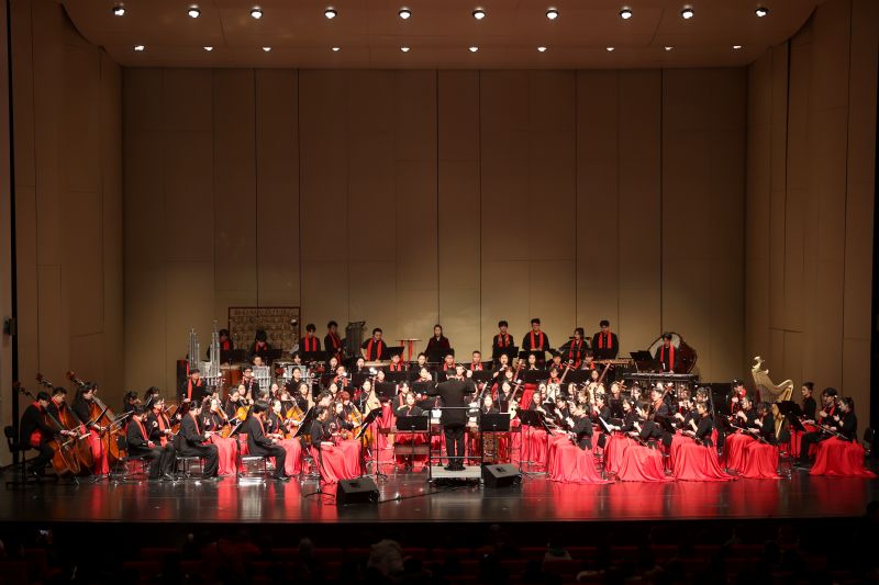 在著名青年指挥家、我院民族器乐系副教授孙鹏的指挥下,我院北方民族乐团和师生以“乐”为媒,传递新春的喜悦与祝福,展现中华文化的博大精深。民族管弦乐《盛》展现了庆典仪式的庄重、欢庆与典雅,寓意新一年的兴旺与美好;《思念》宛如抒情浪漫的倾诉,深情地表达了相思与怀念之情;古筝协奏曲《定风波》、唢呐与乐队《百鸟朝凤》以及民族管弦乐《新金蛇狂舞》《春华秋实》等作品,在保留民族音乐传统韵味的同时融入当代审美,赋予了乐曲更丰富的时代表达,更加彰显了民族音乐的独特魅力。当晚还演出了极具东北地域风格特色的民间小调《丢戒指》和东北民歌《看秧歌》,展现了东北人民风趣诙谐的性格和东北地区独特的民俗文化;歌曲《远情》旋律深邃优美,歌声令人动情。音乐会特邀中国民族管弦乐学会会长、中国音乐家协会琵琶学会会长、我国民族器乐领域知名专家吴玉霞演出琵琶协奏曲《云想花想》。演奏家通过娴熟的演奏和极具艺术感染力的表演,将作品优美的旋律、灵动雀跃、跌宕起伏的节奏完美呈现,精彩唯美的演奏赢得现场观众的热烈掌声。音乐会在民族管弦乐《我的祖国》气势恢宏的旋律中落下帷幕。整场音乐会引人入胜,珠落玉盘、绕梁遏云的丝竹交响在剧院内回荡,现场观众对演出报以经久不息的热烈掌声。
