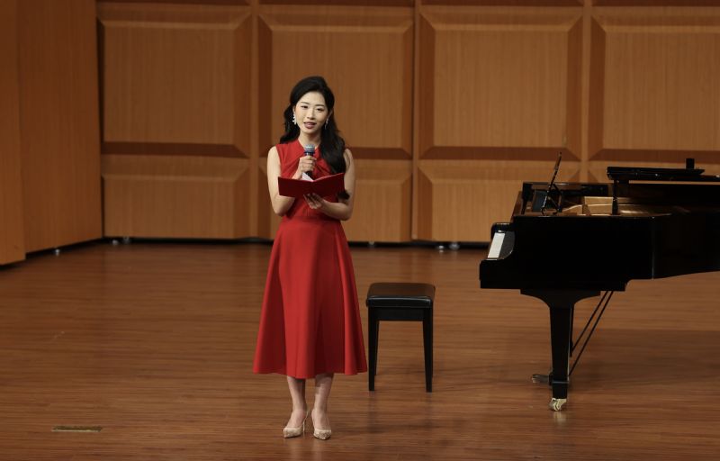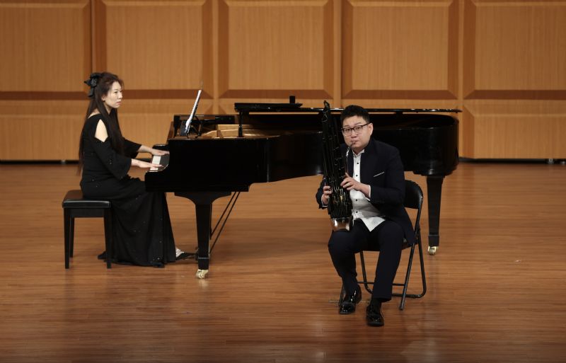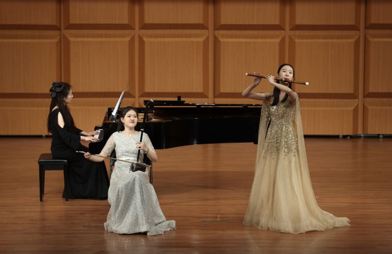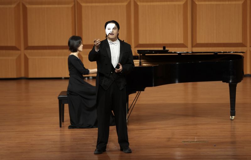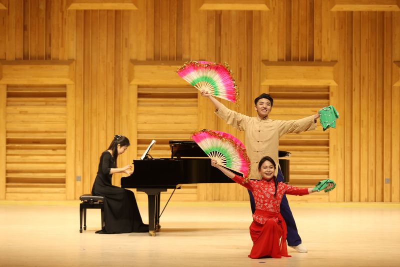 演出涵盖民族声乐演唱、民族器乐和管弦乐演奏、歌剧、音乐剧、钢琴、巴扬演奏等多种艺术表演形式,演出既展现了西方古典音乐艺术魅力,又彰显了中华优秀传统文化的丰厚底蕴。演出在独唱《斗牛士之歌》雄浑激昂的歌声中拉开序幕,随后,钢琴独奏《斯克里亚宾前奏曲集》,演奏者用精湛的技巧诠释了浪漫主义至神秘主义的风格跨越;一曲《山丹丹开花红艳艳》,高亢悠扬的歌声唱出了信天游跌宕的声情和黄土地的炽烈情怀;二胡与竹笛重奏《陌上花开》,通过二胡的婉转绵长与竹笛的清亮灵动交织,展现出自然与人文交融的盎然诗意。小提琴独奏《引子与回旋随想曲》,通过小提琴的深沉抒情与激情奔放的技巧对比,交织出浪漫主义的诗意与戏剧性的张力。东北民歌《双回门》,以诙谐生动的表演展现出东北地区独具特色的地域文化。笙独奏《甘榜印象》则以笙的丰富和声与悠扬音色,刻画出田园生活的质朴欢愉,展现出传统与现代交织的民俗画卷。音乐剧《剧院魅影》经典唱段《夜之乐章》,将古典美声与现代流行音乐完美融合,表现出独特的音乐风格。