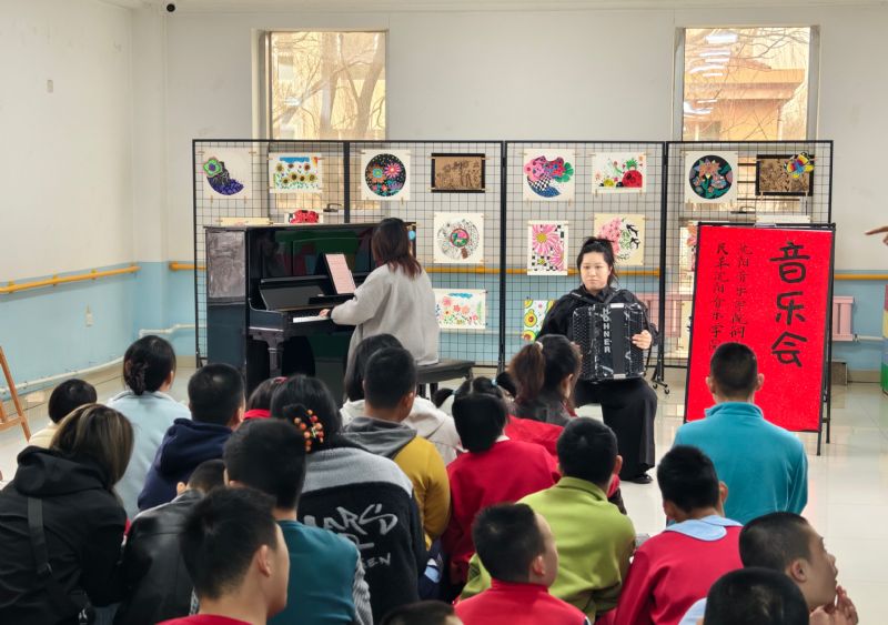 在福利院精心布置的演出厅内,“红色文艺轻骑兵”小分队的师生们用指尖流动的音符为孩子们演奏了一曲曲动人的乐章。勃拉姆斯《间奏曲》的深邃、舒曼《梦幻曲》的朦胧、黄虎威《巴蜀之画》的斑斓,构建起跨越时空的音乐对话。创新编排的钢琴与手风琴合奏《贝加尔湖畔》,优美的旋律和清澈的音色引发孩子们轻声哼唱;经典民乐改编的《茉莉花幻想曲》则体现了中西合璧的音乐特色。本场演出既是一次键盘艺术的生动展示,更成为浸润童心的美育课堂。演出尾声,师生与孩子们共唱《世界赠予我的》,纯净的童声与悠扬的琴韵交织成动人的“春之乐章”。