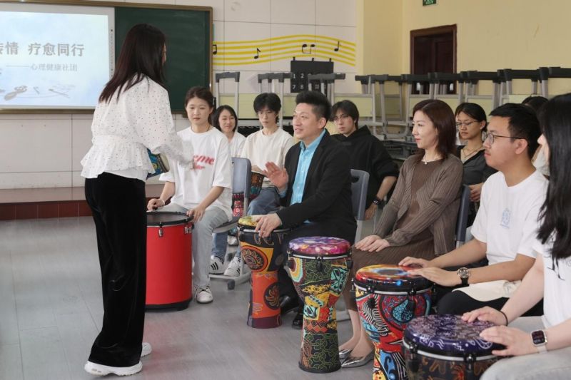在心理健康社团,院长田彦与同学们一起参与“鼓圈心理疗愈”特色活动,在《我和我的祖国》节奏韵律中感受艺术疗愈的独特魅力。在交流中,同学们表示参与心理健康社团,既是释放心灵压力的“减压阀”,又是重塑精神内核的“疗愈站”,实现了从心灵疗愈到精神升华的蜕变。田彦指出,心理健康教育工作要打破传统说教模式,充分发挥音乐、绘画、戏剧等艺术载体“润物无声”的育人功能,将心理健康教育有机融入课程教学、校园活动与日常生活场景,汇聚家庭、学校、社会等多方资源,打造立体化育人环境,为大学生的身心健康发展筑牢坚实屏障,护航学生在阳光下健康成长。