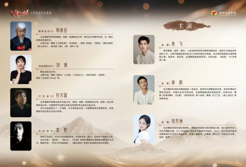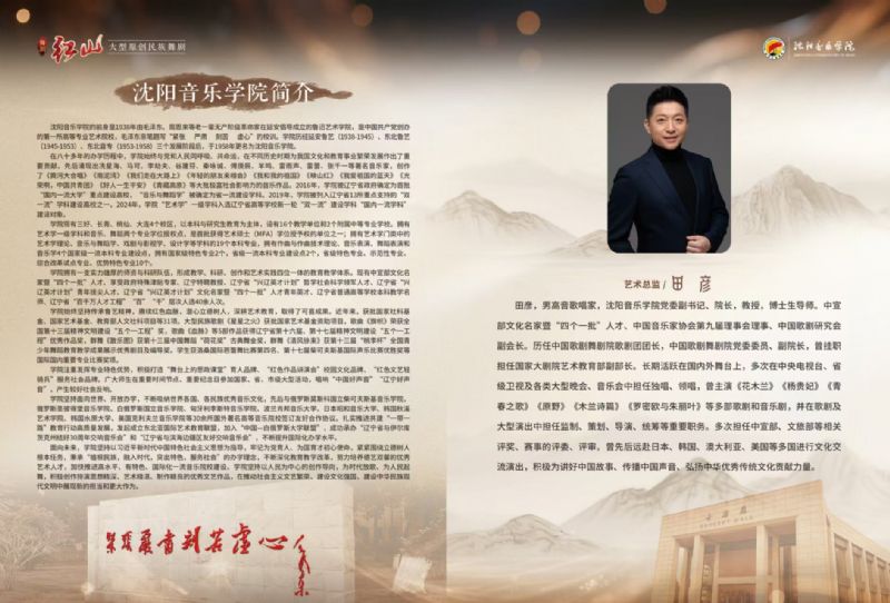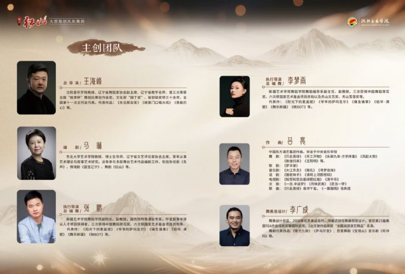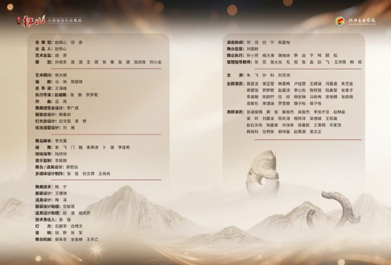 《红山》由沈阳音乐学院出品演出,省委宣传部、省文化和旅游厅、省文化演艺集团、省公共文化服务中心、朝阳市委宣传部、朝阳市文化旅游和广播电视局支持。剧目被列为辽宁省委宣传部文艺精品创作重点资金扶持项目、沈阳音乐学院“双一流”建设项目。创作团队以艺术匠心守护文化根脉,将五千年红山文明的神秘密码解构为新时代最动人的艺术诗篇,让古老文明在当代舞台上焕发新生。
