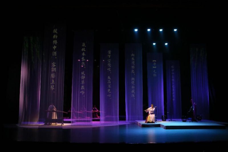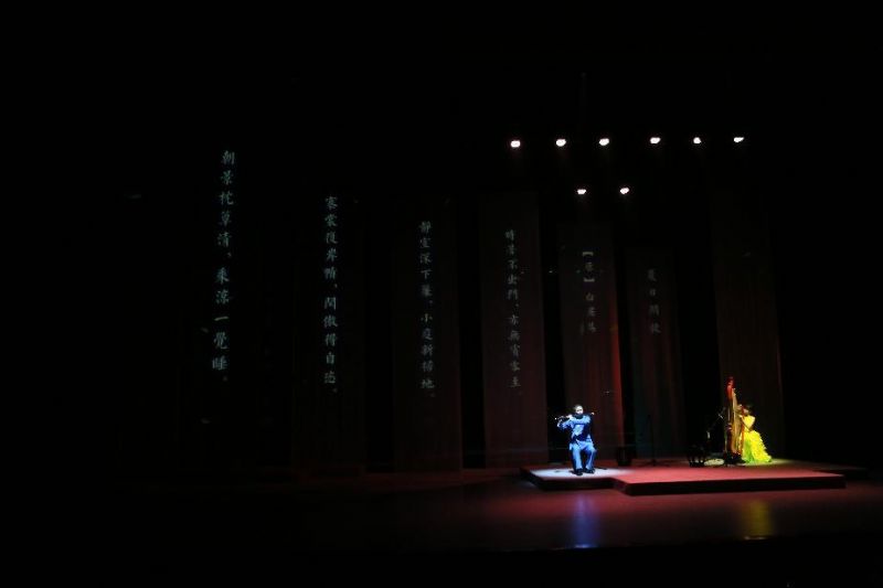 《夏至》奏响,高亢清越的笙音喷薄而出,古筝的弦音密集如骤雨,和中阮共同奏响盛夏最激昂的乐章。《大暑》通过竹笛悠扬的旋律与箜篌的“嘈嘈切切错杂弹”,将大暑时节万物在极限环境下迸发的顽强生命力渲染得淋漓尽致。战鼓声起,穿云裂石,一曲气势恢宏的《秦王破阵乐》回荡在剧场内,笛声激越昂扬,充满了磅礴的古意与蓄势待发的力量,在夏日的尾声激荡起雄浑壮阔的回音。凉风初至,暑意未消,《立秋》将古筝与二胡深情对话,弦音交织缠绕。