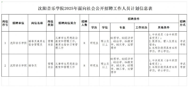 沈阳音乐学院2025年面向社会公开招聘工作人员计划信息表