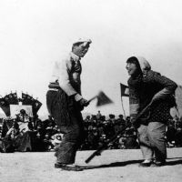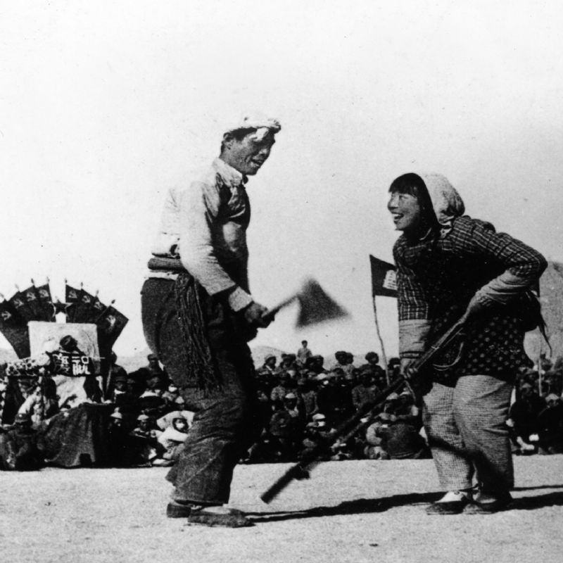 1943年,鲁艺演出秧歌剧《兄妹开荒》(扮演者王大化、李波)
