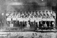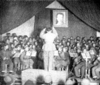 1946年,在纪念冼星海逝世一周年大会上,师生演唱《黄河大合唱》(指挥:刘炽)