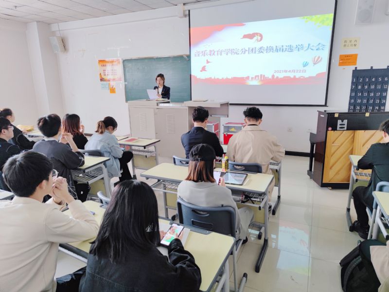 4月22日12:00在长青校区第二教学楼201召开音乐教育学院团员代表大会完成分团委换届选举。按照组织要求,音乐教育学院有选举权的18级、19级、20级本科及研究生团员代表(全体团员的5%)出席了本次大会,会议由音乐教育学院分团委书记李静霞主持。本次换届大会采取公平公正现场投票唱票的方式,产生了新一届分团委委员会成员:书记1名李静霞,副书记1名刘泓江,其他委员5名:丁天惠、王寅霏、陈靓蕊 、林榕煊 、李兆祎。李静霞对本次换届大会进行了总结,在对本次大会圆满成功表示祝贺的同时也对分团委工作提出了新要求。特别指出,学生干部应树立终身学习的观念,不断提高自我,完善自我。会后,在音乐教育学院内部对新一届委员会成员进行了公示。