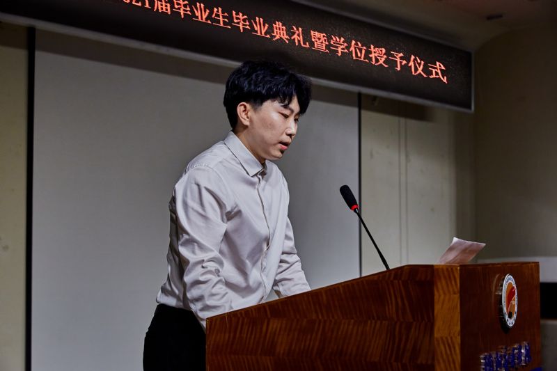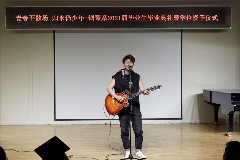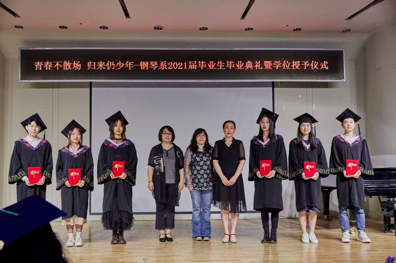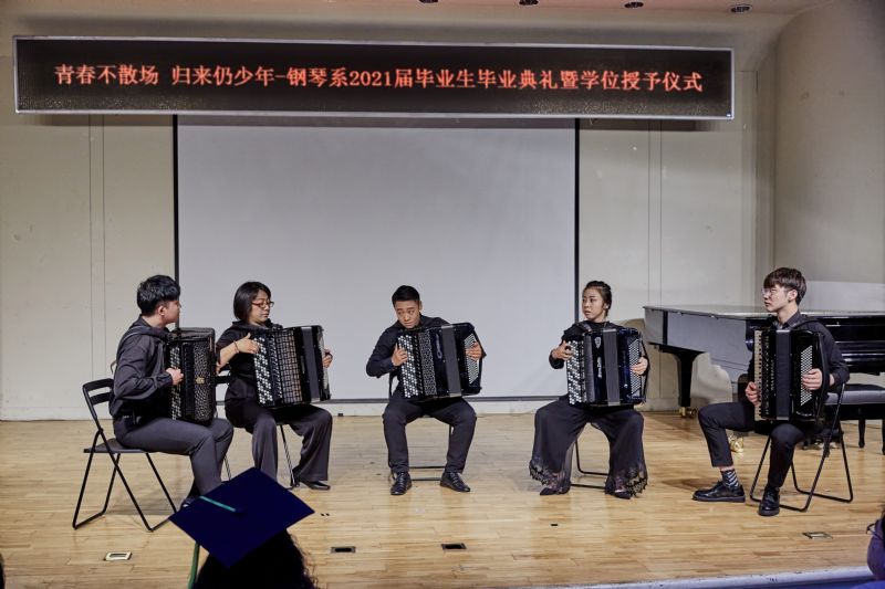 声乐歌剧系2019届本科毕业生崔浩然演唱的歌曲《启程》《当我想你的时候》拉开了本次毕业典礼的帷幕。典礼共有七项内容。一是钢琴系主任李哲致辞;二是党总支副书记辛德万宣读钢琴系2021届毕业生毕业情况;三是系主任李哲为2021届研究生、本科生毕业生拨冠正穗并授予学位;四是表彰优秀学生,钢琴系党总支书记程宪伟、副主任崔秀峰、主科教研室主任毕雪莲、副科教研室主任张一茵、手风琴教研室主任孙阿瑶为省优秀毕业生、院优秀毕业生、院专业优秀毕业生颁发荣誉证书;五是教师代表马东妮发言,研究生毕业生代表赵圣唯、本科毕业生代表石佳卓发言,辅导员董帅为全体毕业生送祝福;六是兰依澳、孙阿瑶、李姝逾、吕璇、李根表演手风琴五重奏《霍尔堡组曲》ⅠⅡⅢⅤ;七是党总支书记程宪伟总结讲话。