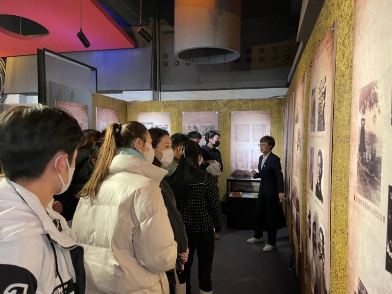戏剧影视学院院长杨喆向校史馆讲解员宋维薇老师介绍说:这次活动是戏剧影视学院深入推进《百年卓越》系列活动之红色寻访的一部分,希望通过重温校史,增强师生对红色基因的自我认同感,坚定赓续鲁艺精神的初心使命,做好新时代的沈音人。同时,这次活动也是上学期戏剧影视学院开展《百年卓越》系列活动中,艺术创作的延续。通过上学期开展的红色寻访,师生们结合各自专业特点积极投入沉浸式教学和艺术创作。目前戏剧影视表演系正在创排一部传承鲁艺精神的原创话剧,今天来访的26名师生正是该剧目的排演者,他们为了更好地诠释角色,演绎作品,今天满怀对鲁艺前辈的敬仰之心走进校史馆,走近鲁艺人。