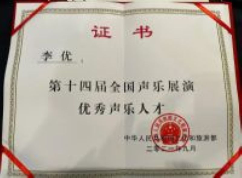 9月19日、20日晚,“全国声乐领军人才培养计划”暨第十四届全国声乐展演民族组在哈尔滨音乐厅举行。我院民族声乐系教师李优作为参加展演评比的选手,从众多选手中脱颖而出,获得了参加培养计划的资格,荣获了由中华人民共和国文化和旅游部颁发的“优秀声乐人才”证书。