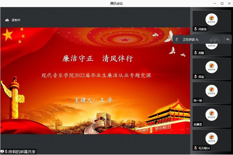 为贯彻落实《沈阳音乐学院毕业生廉洁从业主题教育方案》文件精神,大力弘扬中华优秀廉洁文化,传承鲁艺精神,进一步引导毕业生涵养廉洁品格、树立廉洁从业意识,现代音乐学院党总支副书记、纪检委员王华通过线上直播的形式为2022届全体毕业生讲授廉洁从业专题党课。