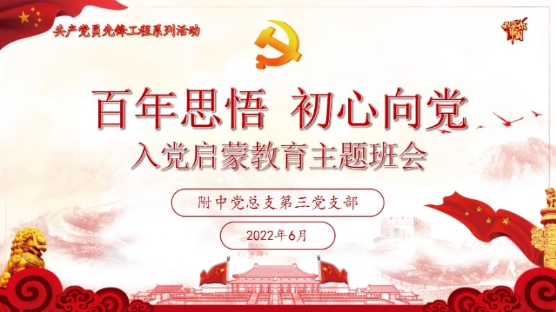 时值中国共产党成立101周年之际,为迎接党的二十大胜利召开,引导学生积极向共青团和党组织靠拢,帮助学生“扣好人生第一粒扣子”。2022年6月20日至6月24日,附中党总支第三党支部积极响应党总支号召,充分发挥支部教师的党员先锋模范作用和工作岗位优势,利用网络平台在全校学生范围内组织开展“百年思悟 初心向党”入党启蒙教育。