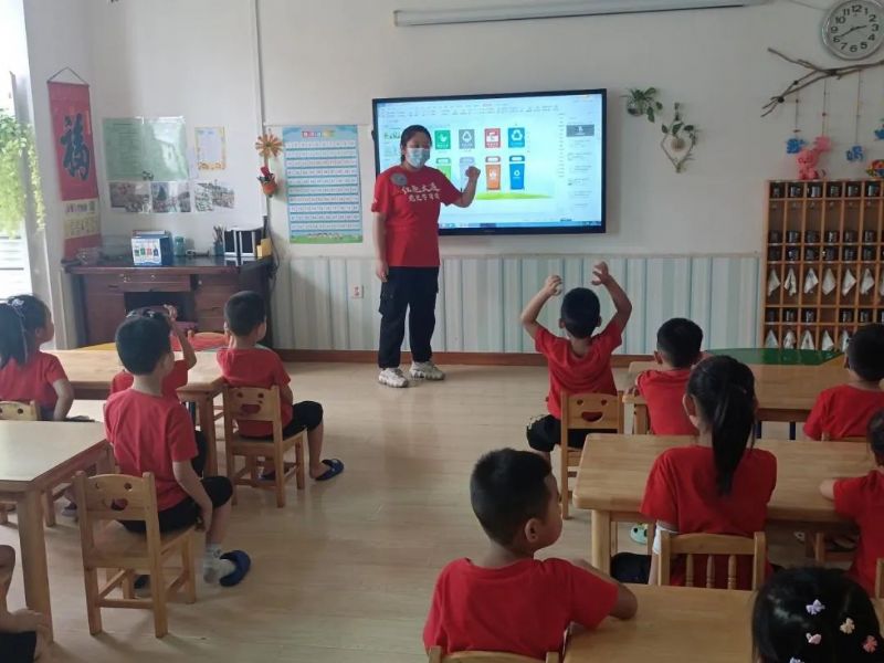 团队成员苗露带领中一班小朋友开展垃圾分类小课堂,她随机抽取9件物品让小朋友们进行分类,小朋友们积极参与,课堂氛围活跃。团队成员史莲淼带领中二班小朋友开展交通安全对对碰,配合交通安全奇遇记工具包,讲述交通安全小故事,与小朋友共上一堂沉浸式的交通文明小课堂。团队成员郭校辰、苗露、史莲淼带领中三班小朋友做团队训练和手工课,教小朋友认识国旗、党旗、军旗、团旗、队旗,讲解每一面旗帜的含义,让小朋友们一起通过游戏的方式加深对知识的理解。