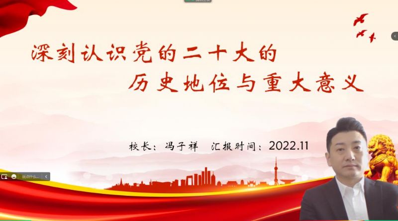 校长冯子祥,在课堂上从三个方面深入讲解党的二十大的历史地位与重大意义:1、继往开来:以党的伟大自我革命引领伟大社会革命,走好新时代新征程新的赶考之路;2、举旗定向:高举中国特色社会主义伟大旗帜,在新时代新征程上一以贯之坚持和发展中国特色社会主义;3、谋篇布局:对全面建成社会主义现代化强国作出战略部署,以中国式现代化全面推进中华民族伟大复兴。党的二十大高举中国特色社会主义伟大旗帜,全面贯彻习近平新时代中国特色社会主义思想,系统阐述新时代坚持和发展中国特色社会主义的重大理论和实践问题,对新时代新征程全面建设社会主义现代化国家、全面推进中华民族伟大复兴的一系列重大决策作出整体部署,具有特殊的历史地位和深远的历史意义。