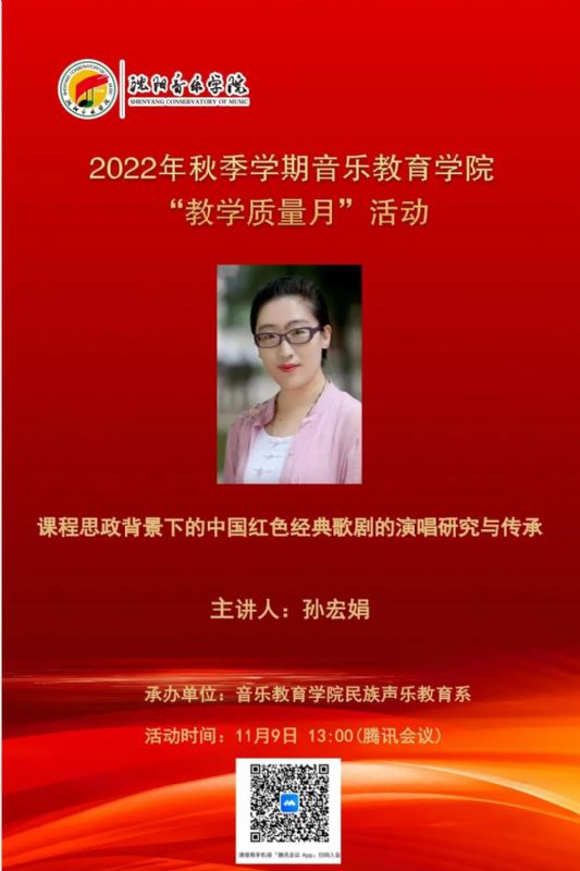 11月9日13:00民族声乐教育系举办了题为《课程思政背景下的中国红色经典歌剧的演唱研究与传承》公开课,主讲人音乐教育学院副院长孙宏娟教授。本系部门师生参加此次公开课。