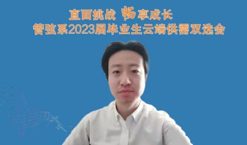 本次网络供需双选会安排了三项环节。第一部分是专业展示,由三名分别来自弦乐、管乐、打击乐演奏专业的学生作为代表进行作品片段展示,使用人单位初步了解我系毕业生专业概况;在第二部分的交流问答环节中,双方就专业问题、岗位需求、工资待遇标准、职业前景、行业未来发展等方面进行了沟通交流,通过交流使毕业生对相关乐团具体情况以及行业未来发展有了一定的认识与了解;最后,副主任(主持工作)谢江做了总结发言。他感谢各用人单位莅临本次会议,既为管弦系学生搭建了交流展示平台,又为2023届毕业生提供了就业实践契机。
