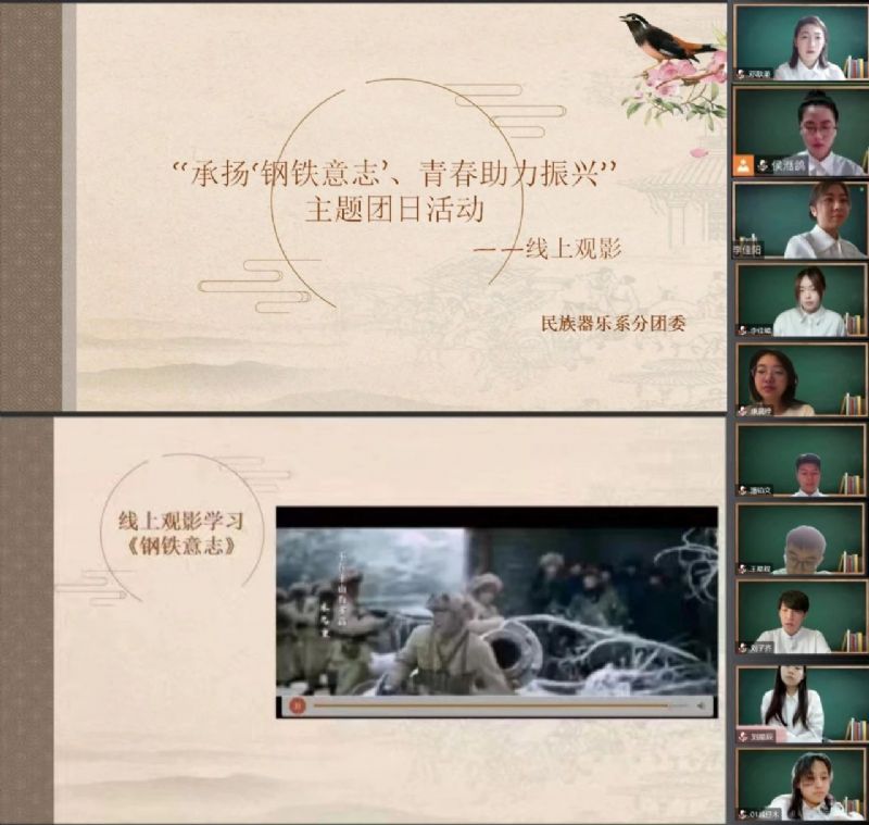 10月26日民族器乐系分团委开展了线上主题团日活动—观看影片《钢铁意志》。该影片彰显了一个时代的使命与责任,更是一代青年的奉献与担当。他们以生命为熔炉,在不断淬炼中成长,练就钢铁意志。