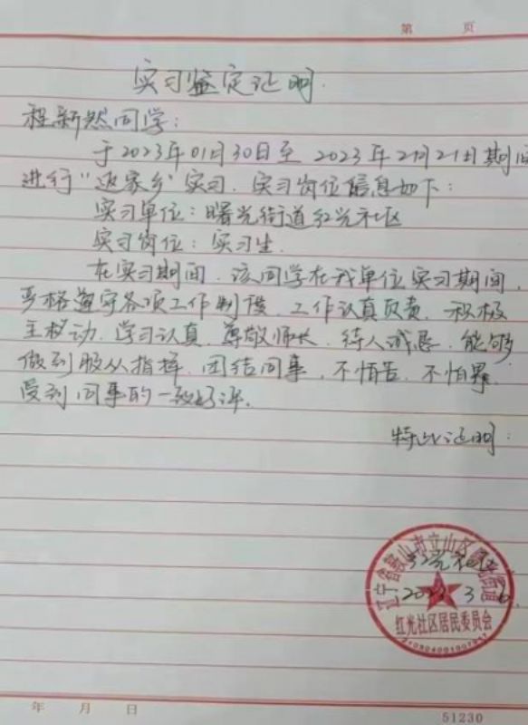 实践经历:通过“返家乡”平台被吉林省白石山镇政府录用,主要负责收发文件、编辑文稿、接打电话、记录会议通知、整理党籍文书等。
