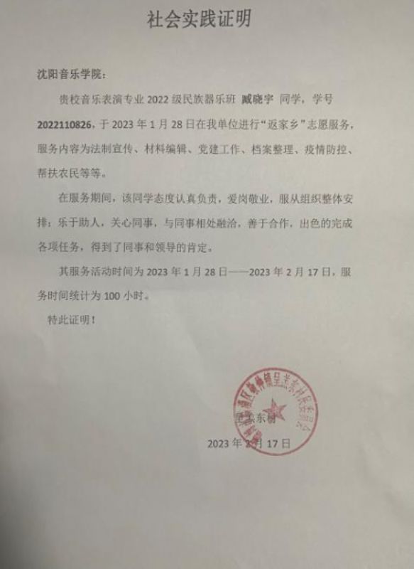 为全面贯彻落实党的二十大精神,深入领会习近平总书记关于青年工作的重要思想,坚持“受教育、长才干、作贡献”的宗旨,寒假期间,民族器乐系分团委积极发动学生返回家乡参与社会实践,深入开展政务实践、企业实践、公益服务、社区服务、乡村振兴、文化宣传等活动,教育引导民乐学子在服务家乡、服务人民中学思践悟习近平新时代中国特色社会主义思想和党的二十大精神。这个寒假,民乐学子共有9人通过“返家乡”平台申请实践岗位,51人通过其他途径申请岗位,参与率占学生总数近20%,征集实践案例60个,在基层服务中彰显新时代青年担当,展现青春风采。在此对30项优秀活动分三期予以展示,让我们一起来看看他们的“返家乡”实践故事吧!