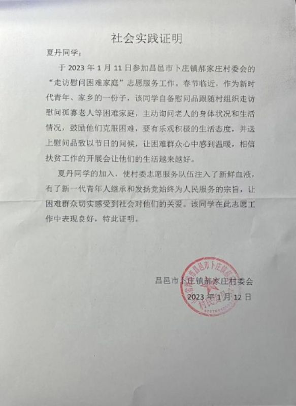 实践经历:跟随村组织走访慰问孤寡老人等困难家庭。