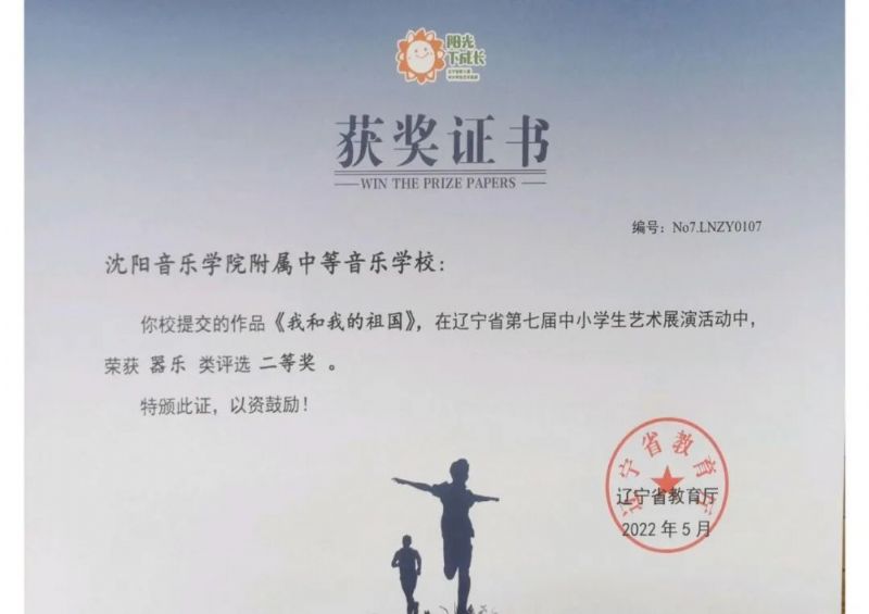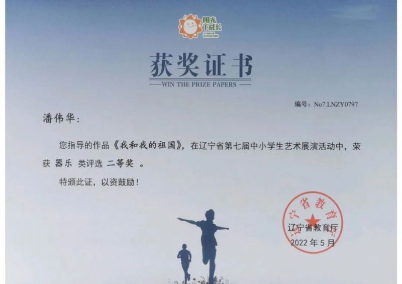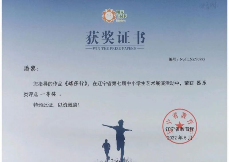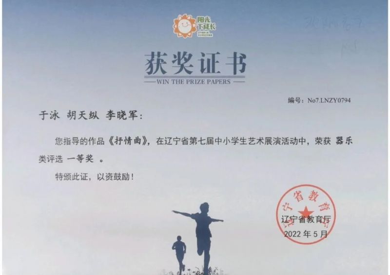在2022年5月结束的“辽宁省中小学生艺术展演”中,由我校教师于泳、胡天纵、李晓军指导的作品《抒情曲》荣获器乐类评选一等奖,潘黎指导的《踏莎行》荣获器乐类评选一等奖,潘伟华指导的《我和我的祖国》荣获器乐类评选二等奖,潘黎指导的《龙腾虎跃》荣获器乐类评选三等奖。