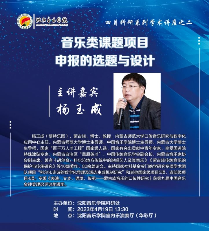 科研处将于四月举办《谈科研项目的选题》(宋瑾教授);《音乐类课题项目申报的选题与设计》(杨玉成教授);《中华民族音乐文化瑰宝一中国维吾尔木卡姆》(赵塔里木教授)系列讲座。