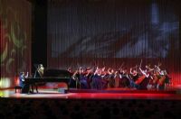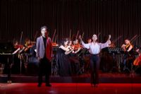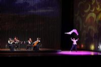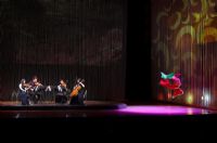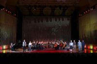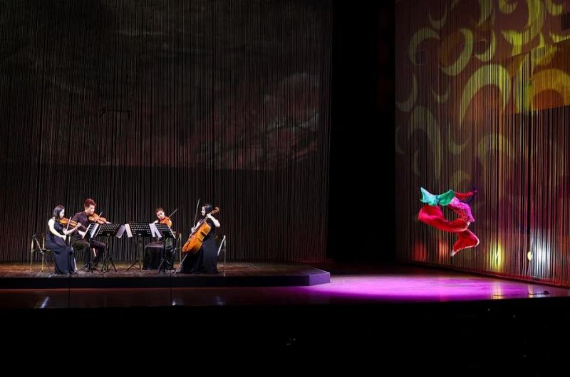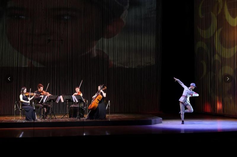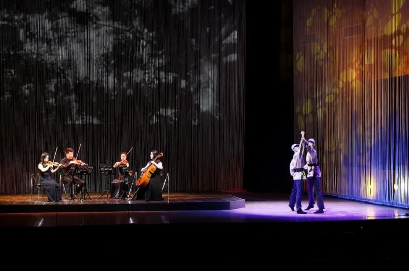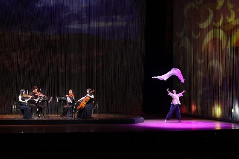 演颂会在我院室内乐团演奏的《延安颂》中拉开序幕。乐曲气势宏大、委婉流畅,将抒情性与战斗性有机融合,追溯了延安红色血脉,抒发了中国青年对祖国美好未来的无限憧憬之情。著名演播艺术家房明震在钢琴与中提琴唯美的乐曲中,满怀激情地朗诵了毛主席诗词《沁园春·雪》。全词融议论、抒情于一炉,大气磅礴、感情奔放,颇能代表毛主席诗词的豪放风格。弦乐四重奏《游击队之歌》旋律轻松流畅、生动活泼,节奏感强,与舞蹈演员不同的状态切换相融合,表达了游击队员灵活与敌人周旋、伺机消灭敌人的典型形象。