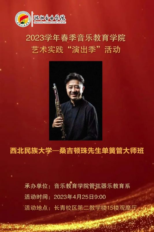 音乐教育学院管弦器乐教育系于2023年4月25日在长青校区第二教学楼15楼演奏厅举办了西北民族大学单簧管教授桑吉顿珠先生大师课。本次活动对于管弦器乐教育系单簧管专业乃至木管专业教学及师生了解国内前沿教学模式,有着重要意义。