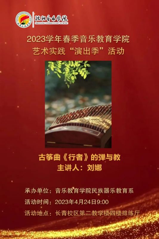 音乐教育学院民族器乐教育系于2023年4月25日在第二教学楼四楼排练厅举办了由刘娜老师主讲的古筝曲《行者》的弹与教公开课。