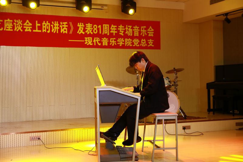 音乐会由现代音乐学院党总支书记米磊,现代音乐学院院长吕威霖担任总策划,精心准备8首作品。米磊作开场致词,随后我院师生先后倾情奉献了电子管风琴独奏《中国大运河》,男女对唱《映山红》、《南泥湾》、《不忘初心》、《像你一样》,器乐合奏《唱支山歌给党听》、《思念》,男声独唱《在那东山顶上》,电子管风琴重奏《红旗颂》,为观众呈现了丰富的视觉盛宴,掌声和欢呼声此起彼伏,台上台下成了激情四溢的海洋。