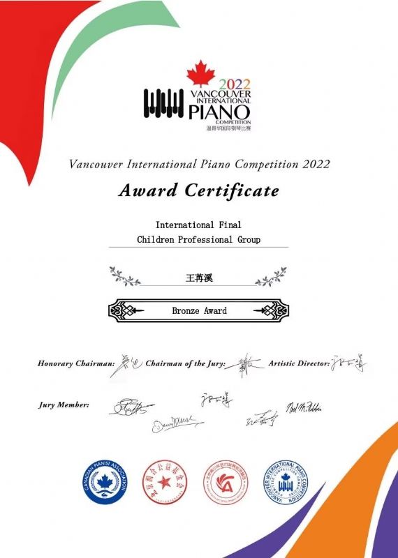 在2022温哥华国际钢琴比赛(2022 Vancouver International Piano Competition)中,我校键盘学科初二年级学生王苒溪经过3轮比赛的激烈角逐,最终获得温哥华国际钢琴比赛专业儿童组铜奖(金奖空缺,银奖1名,铜奖1名)。该比赛在中国赛区设立了预选赛和决赛,在中国区决赛中王苒溪同学还获得了中国区决赛专业儿童组一等奖、中国作品专业儿童组一等奖。指导教师张芳教授获优秀指导教师奖。