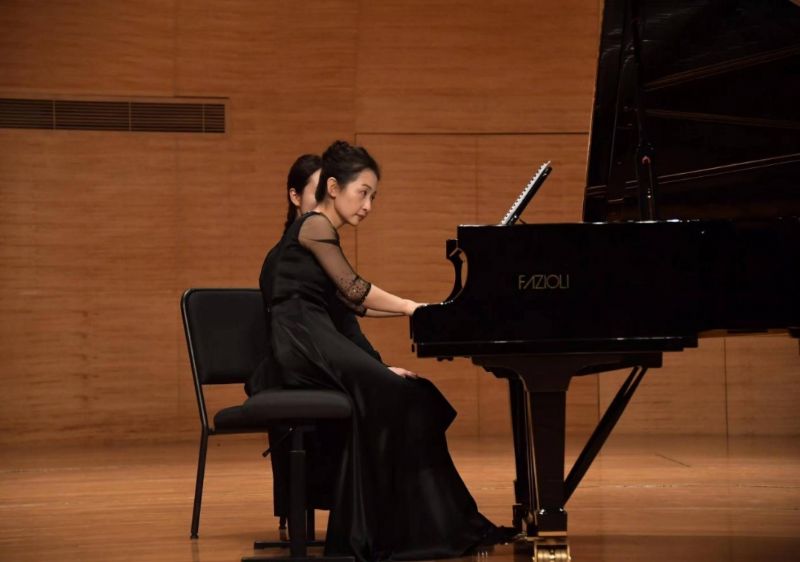 下半场王琦老师与张芳教授共同演奏的普朗克《假面舞会随想曲》和圣桑《引子与回旋随想曲》,她们配合默契,把两首作品风格表现的淋漓尽致,不是单纯的用钢琴模仿乐队的改编曲,而是充分地发挥了钢琴特性的双钢琴作品。曲终,那荡漾着忧愁的音符,那强烈鲜明而奇特的主题旋律,那饱满明亮如葵的金黄音色,那千变万化而光彩无限的乐章,都在一片绚烂中久久绕梁,将整场音乐会推向了高潮,现场掌声雷鸣。