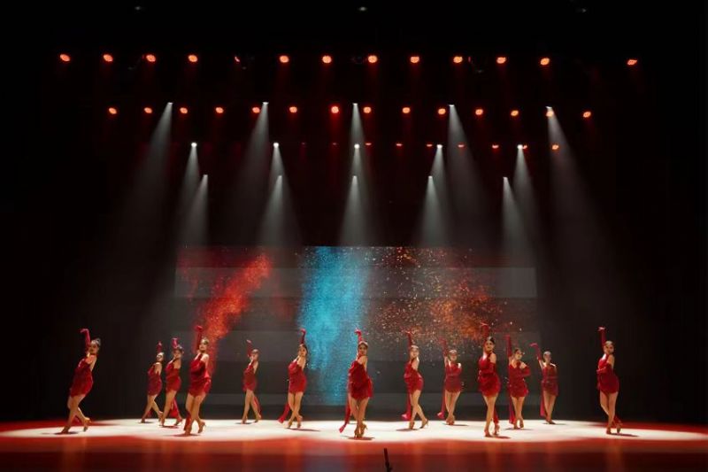 浑厚强劲的鼓声拉开了整场演出的序幕。同学们通过铿锵有力的绕口令组合、戏曲身段与诗词歌赋,展示了扎实的台词基本功和语言技巧能力;在音乐剧剧场舞蹈展示环节,同学们用不同风格的拉丁舞和爵士舞向观众传递出他们的青春朝气和蓬勃热情,流畅灵活的舞蹈动作和身体语言准确传达了角色的情感和角色所处的情境氛围,此环节既展示出国标舞和爵士舞的独特魅力,又展示出音乐剧系同学们对不同舞种的把控能力。