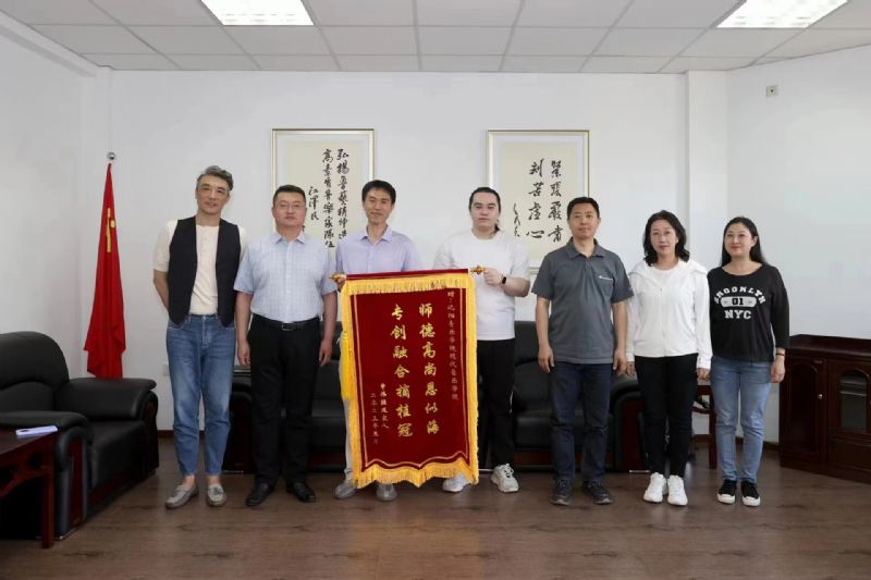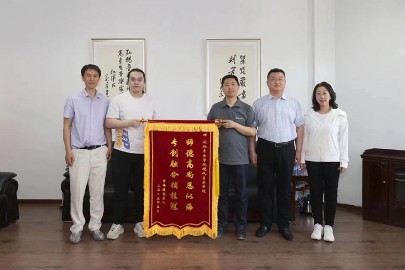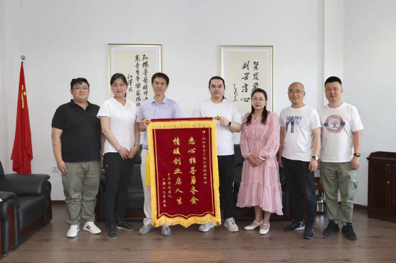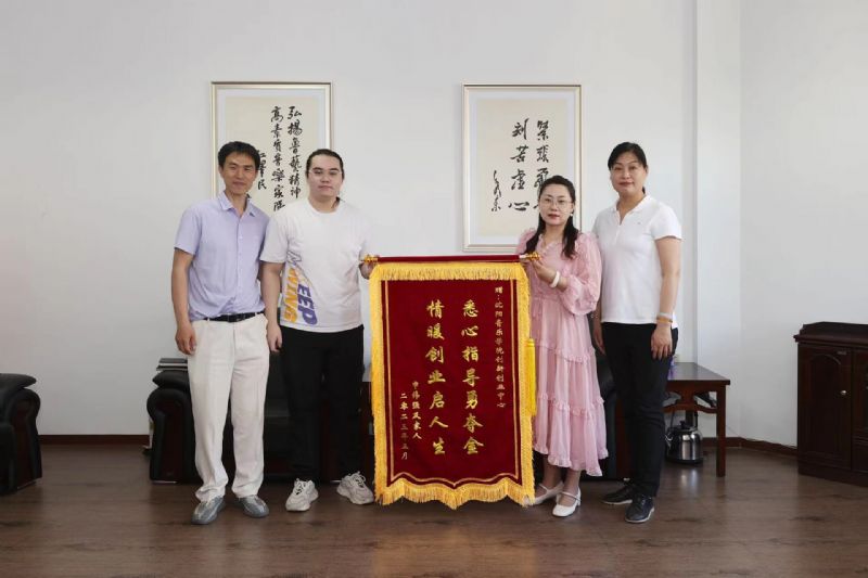 5月29日,现代音乐学院2022届毕业生申伟强与家长,来到我院赠送锦旗,表达学生在2022年参加辽宁省第八届“互联网+”大学生创新创业大赛中,获得高教主赛道金奖,向现代音乐学院的推荐指导、思想引领,培育之恩和创新创业中心将创新创业大赛融入人才培养为学生开启人生,表达感谢之意。现代音乐学院院长吕威霖,党总支书记米磊、党总支副书记王华、辅导员宋志伟;创新创业中心、就业指导中心主任宋洋、副主任褚祎楠、及相关同志参加仪式。
