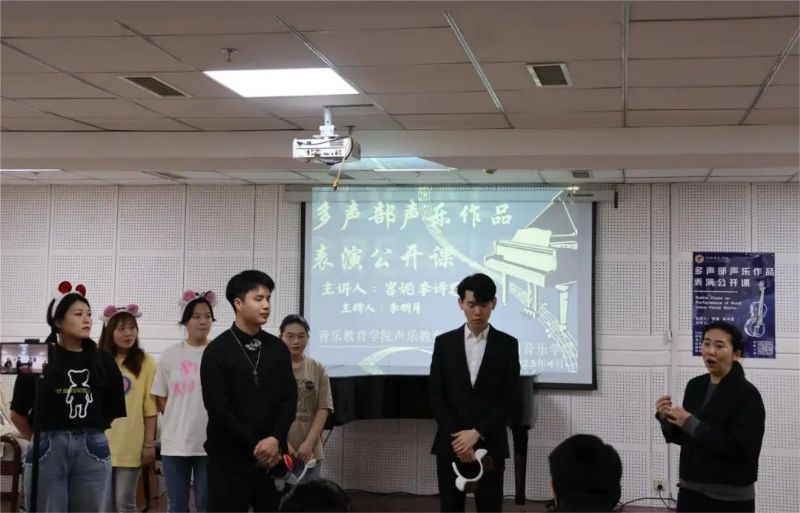 此次公开课由声乐教育系副主任李明月主持,《多声部声乐作品表演》的授课教师宫妮和李诗思分别讲解了多声部声乐的含义以及授课的方式与内容。课堂上,同学们表演了自己编创的节目,两位老师针对剧情、歌词、感情和衔接等问题分别作出指导,最后对多声部声乐作品表演的特点进行了总结,同时鼓励同学们多进行多声部活动的学习排练与表演尝试。