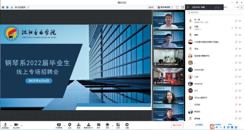为提高我系毕业生就业质量,实现高校与企业的良性互动,形成实习、就业的紧密链接,6月6月,钢琴系组织开展2022届毕业生线上专场招聘会,邀请省内外5家优质用人单位,进行现场企业推介。钢琴系领导班子、辅导员、全体毕业生及低年级学生80余人参加会议。会议由辅导员冯磊主持。
