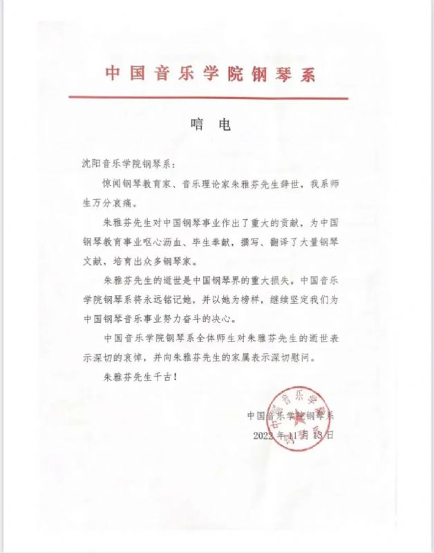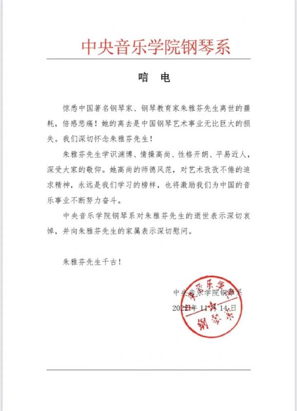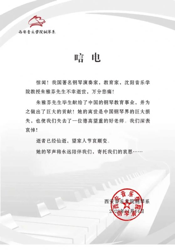 朱雅芬教授为中国钢琴教育事业作出的贡献永远铭记在我们心中!沉痛悼念朱雅芬教授!对她的家人表示深切慰问!