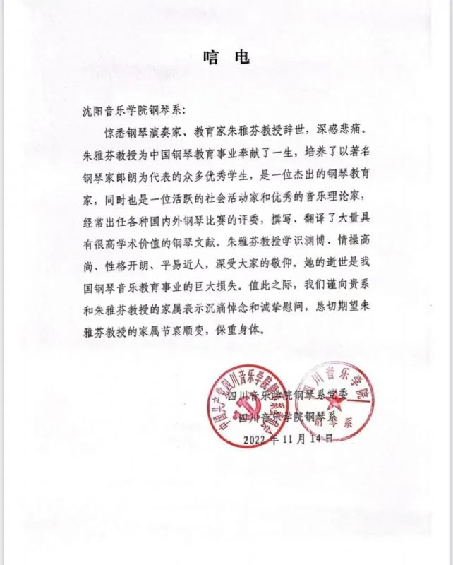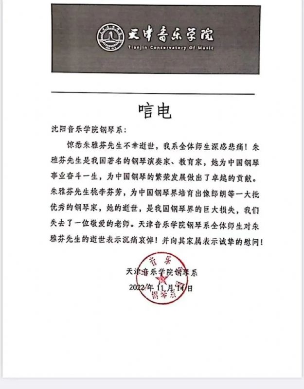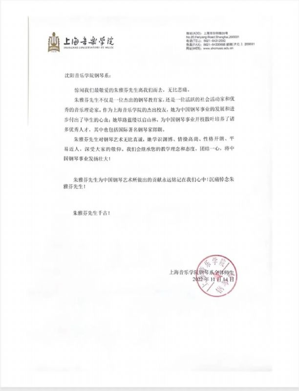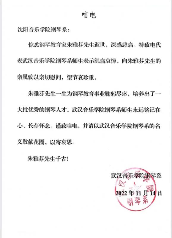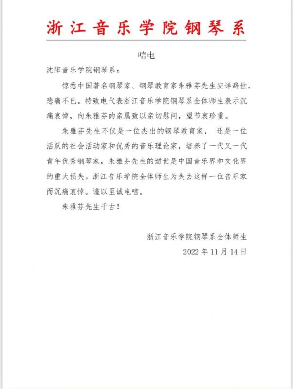 惊悉朱雅芬先生仙逝,深感悲痛!朱先生是我国著名的钢琴家、教育家,为中国钢琴音乐的发展做出了巨大的贡献。朱老师真诚无私地提携后学,培养了很多优秀人才。作为我最敬爱的导师,曾在我个人的成长过程中给予了巨大的帮助。朱先生终生勤奋治学,诲人不倦,桃李芬芳,道德学问为海内外景仰。值此之际,我谨向沈阳音乐学院钢琴系并透过贵系向朱雅芬先生的家属表示沉痛悼念和诚挚慰问!节哀顺变,保重身体!
