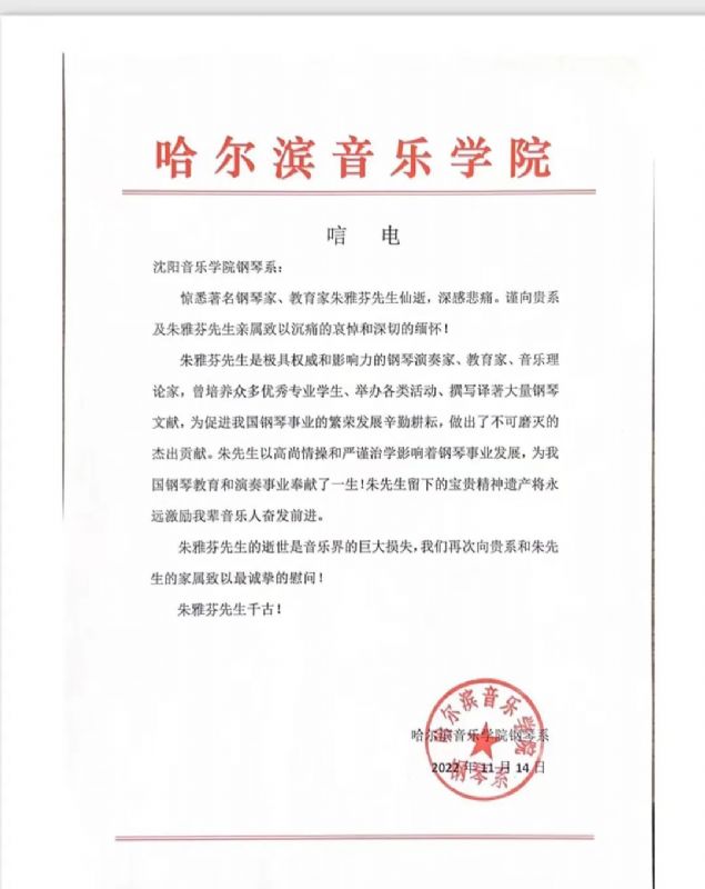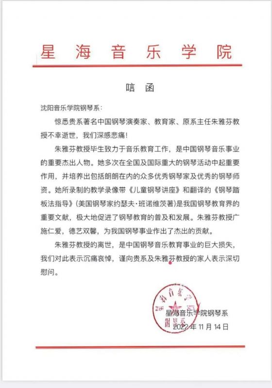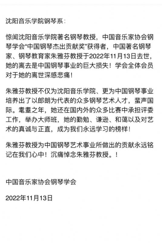 优秀的中国共产党党员、著名钢琴演奏家、教育家、沈阳音乐学院钢琴系原主任朱雅芬教授,因病于2022年11月13日19时47分在北京逝世,享年94岁。