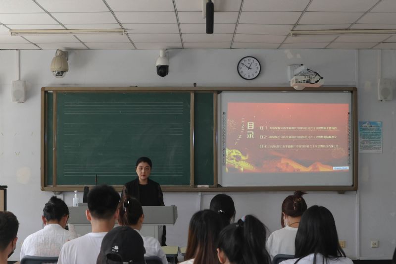 董蓉以“追寻革命足迹 感悟红色精神 奏响新时代‘青年乐章’”为题,围绕“辽宁是新中国国歌素材地”及音乐学系调研团队实地寻访经历,深入宣传阐释辽宁“六地”的丰富内涵和时代价值,给大家上了一堂深刻而生动的形势与政策课。课程分为“触摸历史——新中国国歌素材地探源” “追寻足迹——国歌素材地实地寻访”以及“感悟精神——传百年风华 奏青春乐章”三个篇章,首先介绍了辽宁作为新中国国歌素材地,为国歌创作提供了现实素材、精神素材以及歌词素材;其次为大家呈现了我系师生秉承鲁艺精神与信念,实地走访辽宁四地,为证实国歌素材地在辽宁提供了翔实的论据支撑;最后她向师生提出希望,希望大家要加强理论学习,厚实理论功底,深刻感悟党的创新理论的真理力量、实践力量、人格力量,持之以恒加强思想淬炼、政治历练、实践锻炼、专业训练,不负韶华、不负时代、不负人民。